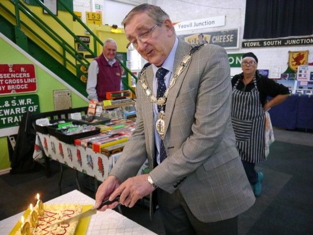 Mayor of Yeovil, Tony Locke kindly cut the cake (Saturday). (Photo courtesy Brian Haigh) |